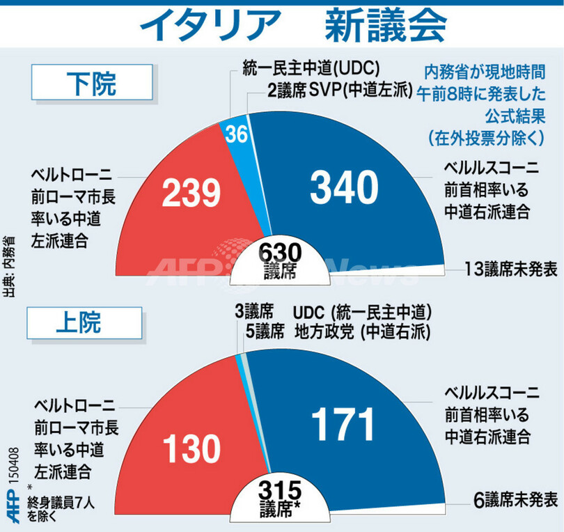 ニュース 政治・経済 図解 【図解】イタリア新議会の議席数 2008年4月16日 21:21 発信地:ローマ/イタリア [ ヨーロッパ イタリア ] このニュースをシェア (c)AFP 【4月16日 AFP】図は、イタリア新議会における各党の議席数を示したもの。(c)AFP<ニュース解説画像一覧へ> 政治・経済 一覧へ> メディア・報道関係・法人の方向け 写真・動画 購入のお問合せ>