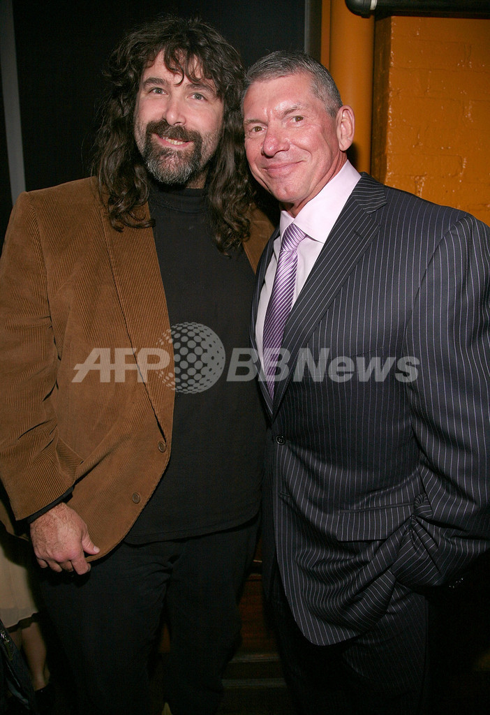 ニューヨーク(New York)のトライベッカ・シネマ(Tribeca Cinemas)で開催された映画『Anamorph』プレミア上映会のアフターパーティーに登場した、レスラーのMick Foley(左)とプロデューサーのヴィンス・マクマホン(Vince McMahon)(2008年4月16日撮影)。(c)AFP/Getty Images/Astrid Stawiarz