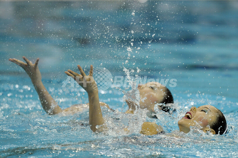 【4月19日 AFP】北京五輪シンクロナイズドスイミング最終予選(The Olympic Games Synchronized Swimming Qualification Tournament 2008)・デュエット、フリールーティン(FR)。テクニカルルーティーン(TR)で2位につけた日本の原田早穂(Saho Harada)/鈴木絵美子(Emiko Suzuki)組は、同種目で3位となる48.084点を記録し、合計96.001点でオープン参加の中国に次ぐ3位に入り五輪への出場権を獲得した。(c)AFP