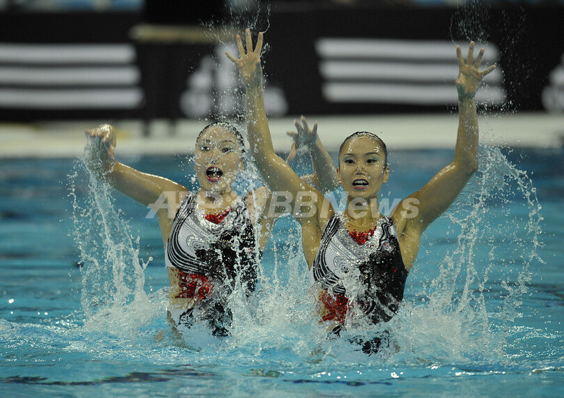 【4月19日 AFP】北京五輪シンクロナイズドスイミング最終予選(The Olympic Games Synchronized Swimming Qualification Tournament 2008)・デュエット、フリールーティン(FR)。テクニカルルーティーン(TR)で2位につけた日本の原田早穂(Saho Harada)/鈴木絵美子(Emiko Suzuki)組は、同種目で3位となる48.084点を記録し、合計96.001点でオープン参加の中国に次ぐ3位に入り五輪への出場権を獲得した。(c)AFP