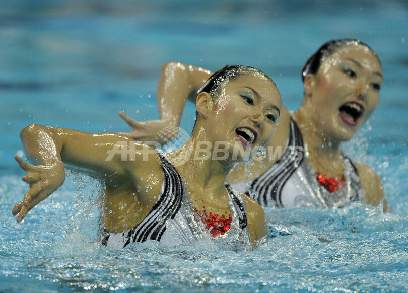 【4月19日 AFP】北京五輪シンクロナイズドスイミング最終予選(The Olympic Games Synchronized Swimming Qualification Tournament 2008)・デュエット、フリールーティン(FR)。テクニカルルーティーン(TR)で2位につけた日本の原田早穂(Saho Harada)/鈴木絵美子(Emiko Suzuki)組は、同種目で3位となる48.084点を記録し、合計96.001点でオープン参加の中国に次ぐ3位に入り五輪への出場権を獲得した。(c)AFP