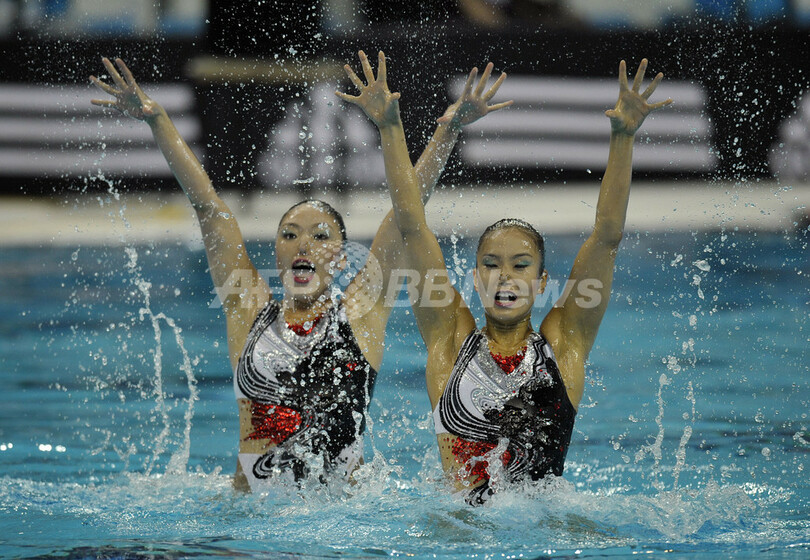 【4月19日 AFP】北京五輪シンクロナイズドスイミング最終予選(The Olympic Games Synchronized Swimming Qualification Tournament 2008)・デュエット、フリールーティン(FR)。テクニカルルーティーン(TR)で2位につけた日本の原田早穂(Saho Harada)/鈴木絵美子(Emiko Suzuki)組は、同種目で3位となる48.084点を記録し、合計96.001点でオープン参加の中国に次ぐ3位に入り五輪への出場権を獲得した。(c)AFP