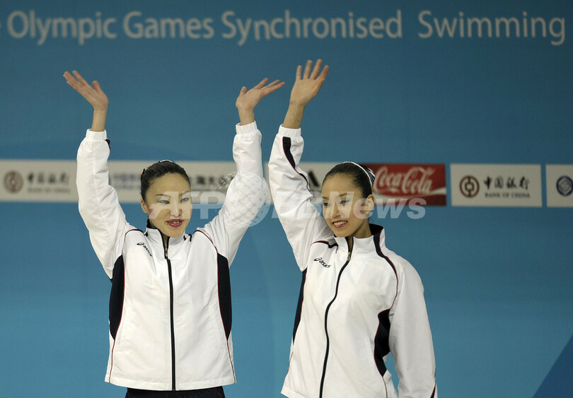 【4月19日 AFP】北京五輪シンクロナイズドスイミング最終予選(The Olympic Games Synchronized Swimming Qualification Tournament 2008)・デュエット、フリールーティン(FR)。テクニカルルーティーン(TR)で2位につけた日本の原田早穂(Saho Harada)/鈴木絵美子(Emiko Suzuki)組は、同種目で3位となる48.084点を記録し、合計96.001点でオープン参加の中国に次ぐ3位に入り五輪への出場権を獲得した。(c)AFP
