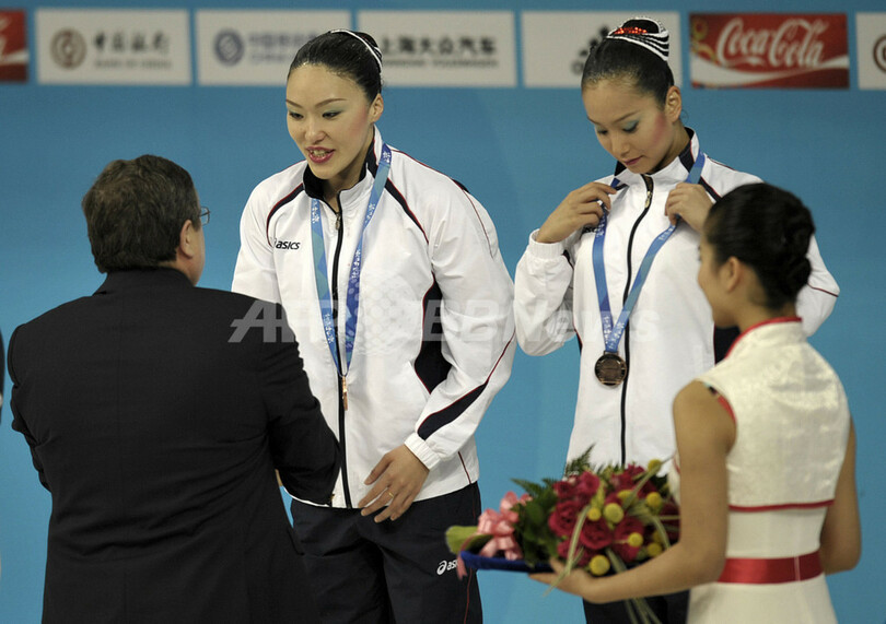 【4月19日 AFP】北京五輪シンクロナイズドスイミング最終予選(The Olympic Games Synchronized Swimming Qualification Tournament 2008)・デュエット、フリールーティン(FR)。テクニカルルーティーン(TR)で2位につけた日本の原田早穂(Saho Harada)/鈴木絵美子(Emiko Suzuki)組は、同種目で3位となる48.084点を記録し、合計96.001点でオープン参加の中国に次ぐ3位に入り五輪への出場権を獲得した。(c)AFP