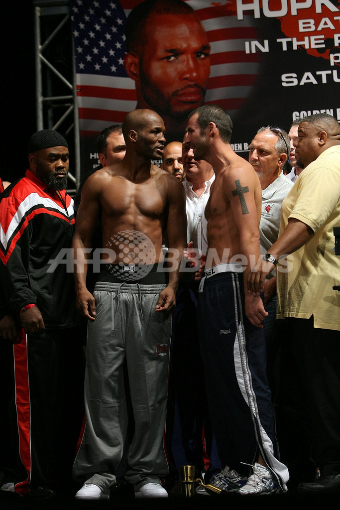 【4月19日 AFP】ボクシング元4冠統一世界ミドル級王者バーナード・ホプキンス(Bernard Hopkins、米国)とWBA/WBC/WBO世界スーパーミドル級王者ジョー・カルザゲ(Joe Calzaghe、英国)は18日、対戦を19日に控えラスベガスのホテル、プラネット・ハリウッド・リゾート・アンド・カジノ(Planet Hollywood Resort & Casino)で公開計量に臨んだ。(c)AFP/Getty Images