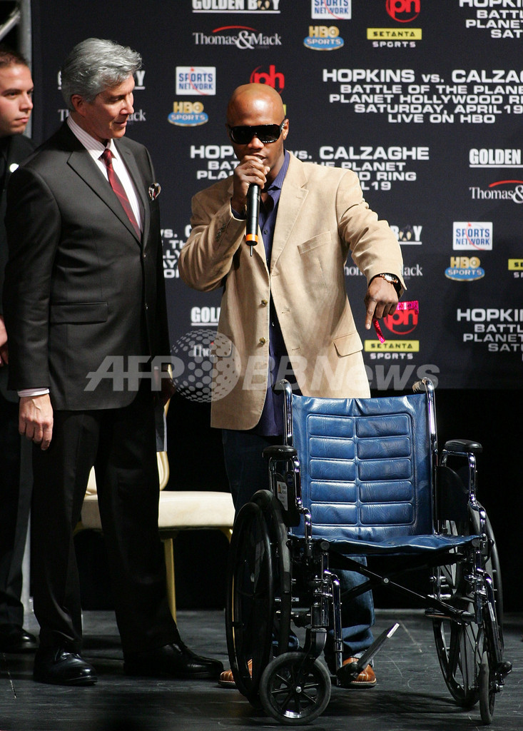 【4月19日 AFP】ボクシング元4冠統一世界ミドル級王者バーナード・ホプキンス(Bernard Hopkins、米国)とWBA/WBC/WBO世界スーパーミドル級王者ジョー・カルザゲ(Joe Calzaghe、英国)は18日、対戦を19日に控えラスベガスのホテル、プラネット・ハリウッド・リゾート・アンド・カジノ(Planet Hollywood Resort & Casino)で公開計量に臨んだ。(c)AFP/Getty Images