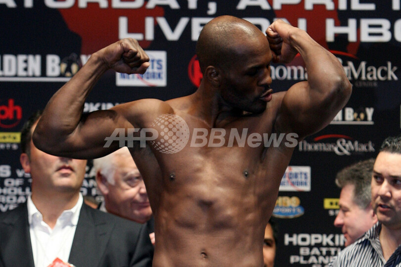 【4月19日 AFP】ボクシング元4冠統一世界ミドル級王者バーナード・ホプキンス(Bernard Hopkins、米国)とWBA/WBC/WBO世界スーパーミドル級王者ジョー・カルザゲ(Joe Calzaghe、英国)は18日、対戦を19日に控えラスベガスのホテル、プラネット・ハリウッド・リゾート・アンド・カジノ(Planet Hollywood Resort & Casino)で公開計量に臨んだ。(c)AFP/Getty Images