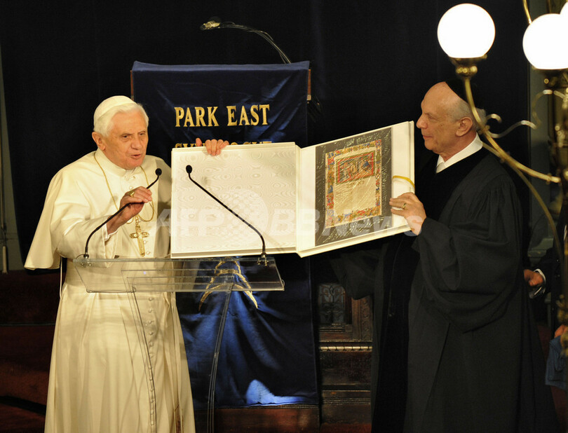 一方法王は今回の訪米でユダヤ教関係者とも積極的に交流を図っている。ワシントンD.C.(Washington)ではユダヤ教指導者と非公式の会談を行ったほか、ユダヤ教の祭りの「過ぎ越し祭」前日にあたる18日には、ニューヨークで、歴代法王として初めてシナゴーグ(ユダヤ教礼拝堂)を訪れた。ニューヨークにあるパーク・イースト・シナゴーグでドイツ出身の法王を迎えたのはオーストリア出身のユダヤ教ラビ(指導者)アーサー・シュナイアー(Arthur Schneier)氏。シュナイアー氏は第2次世界大戦中にナチスによるホロコーストで親類の多くを失った。(c)AFP/Karin Zeitvogel