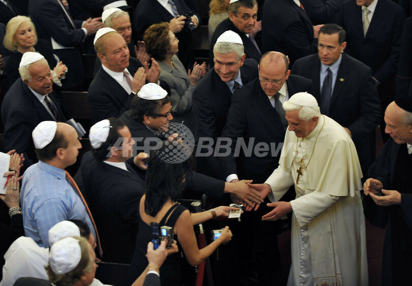 一方法王は今回の訪米でユダヤ教関係者とも積極的に交流を図っている。ワシントンD.C.(Washington)ではユダヤ教指導者と非公式の会談を行ったほか、ユダヤ教の祭りの「過ぎ越し祭」前日にあたる18日には、ニューヨークで、歴代法王として初めてシナゴーグ(ユダヤ教礼拝堂)を訪れた。ニューヨークにあるパーク・イースト・シナゴーグでドイツ出身の法王を迎えたのはオーストリア出身のユダヤ教ラビ(指導者)アーサー・シュナイアー(Arthur Schneier)氏。シュナイアー氏は第2次世界大戦中にナチスによるホロコーストで親類の多くを失った。(c)AFP/Karin Zeitvogel