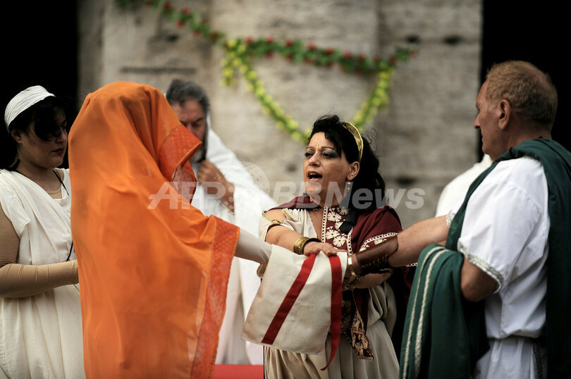 ニュース ライフ ローマの「誕生日」を記念して、古代の結婚式を再現 2008年4月21日 5:11 発信地:ローマ/イタリア [ ヨーロッパ イタリア ] このニュースをシェア ‹ › ❮ 5/23 ❯ イタリア・ローマ(Rome)のマルチェロ劇場(Theater of Marcellus)前で、伝説では紀元前753年4月21日とされるローマの創建を祝うために再現された、古代ローマの結婚式に出演する、古代ローマの新郎に扮装(ふんそう)した男性(右)と新婦に扮装した女性(左2人目、2008年4月19日撮影)。(c)AFP/Filippo Monteforte 画像作成中 ! 【4月21日 AFP】伝説では紀元前753年4月21日に創建されたとされるイタリアのローマ(Rome)。これを記念して19日、市内のマルチェロ劇場(Theater of Marcellus)前で、俳優らが古代ローマ人に扮(ふん)し、当時の結婚式を再現した。(c)AFP ライフ 一覧へ> メディア・報道関係・法人の方向け 写真・動画 購入のお問合せ>