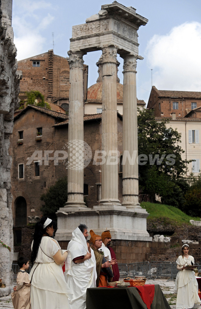 ニュース ライフ ローマの「誕生日」を記念して、古代の結婚式を再現 2008年4月21日 5:11 発信地:ローマ/イタリア [ ヨーロッパ イタリア ] このニュースをシェア ‹ › ❮ 4/23 ❯ イタリア・ローマ(Rome)のマルチェロ劇場(Theater of Marcellus)前で、伝説では紀元前753年4月21日とされるローマの創建を祝うために再現された、古代ローマの結婚式に出演する、古代ローマの神官に扮装(ふんそう)した男性ら(2008年4月19日撮影)。(c)AFP/Filippo Monteforte 画像作成中 ! 【4月21日 AFP】伝説では紀元前753年4月21日に創建されたとされるイタリアのローマ(Rome)。これを記念して19日、市内のマルチェロ劇場(Theater of Marcellus)前で、俳優らが古代ローマ人に扮(ふん)し、当時の結婚式を再現した。(c)AFP ライフ 一覧へ> メディア・報道関係・法人の方向け 写真・動画 購入のお問合せ>