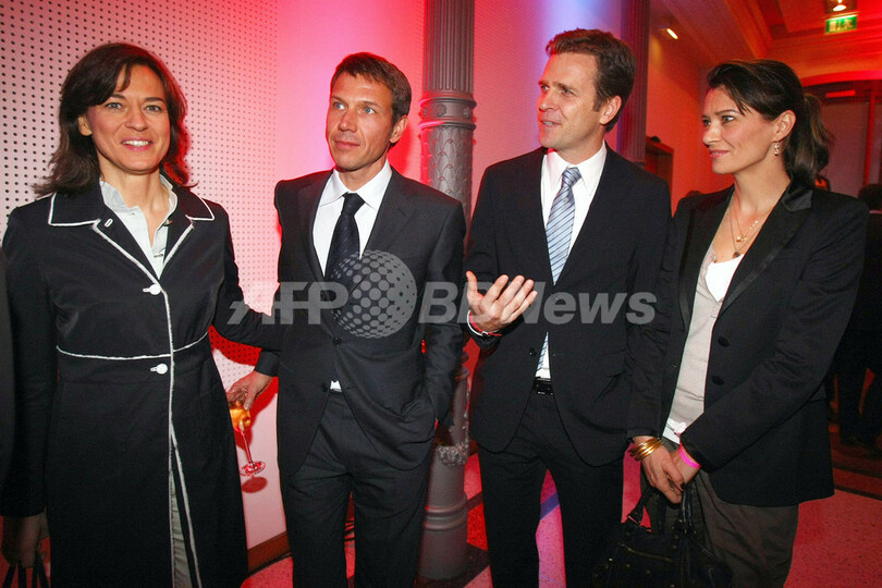 パーティーに参加するドイツテレコム(%%Deutsche Telekom%%)のレネ・オーバーマン(%%Rene Obermann%%、左2)CEOとテレビ司会者でガールフレンドの%%Maybrit Illner%%さん(左)、ドイツ代表のチームマネージャーを務めるオリバー・ビアホフ(%%Oliver Bierhoff%%)氏(右2)と%%Clara Bierhoff%%夫人。(2008年4月19日撮影)(c)AFP/ALEXANDER HASSENSTEIN