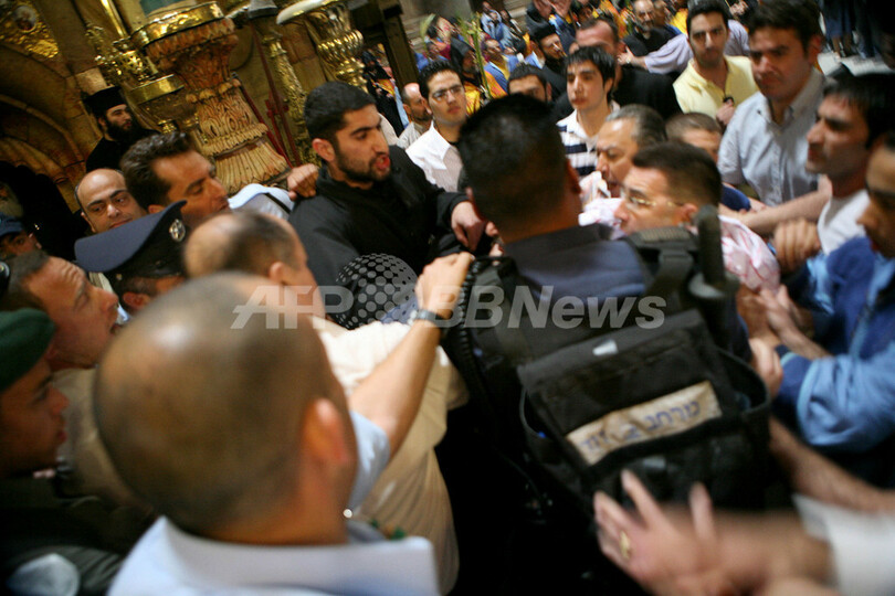 【4月21日 AFP】イスラエルのエルサレム(Jerusalem)旧市街にある聖墳墓教会(Church of the Holy Sepulchre)で20日、キリスト教正教会の「聖枝祭(Orthodox Palm Sunday)」のさなかに、礼拝に出席していたギリシャ人とアルメニア人数十人の間で乱闘が起こり、警官隊が仲裁のために教会内になだれ込む騒ぎとなった。