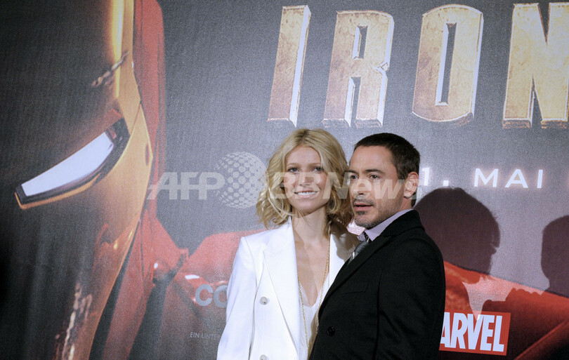 ドイツのベルリン(Berlin)で開催された映画『アイアンマン(原題、Iron Man)』のプレミア上映会のフォトコールでポーズを取る、出演女優のグウィネス・パルトロウ(Gwyneth Paltrow、左)と出演俳優のロバート・ダウニー・Jr.(Robert Downey Jr.)(2008年4月22日撮影)。(c)AFP/DDP/MICHAEL KAPPELER