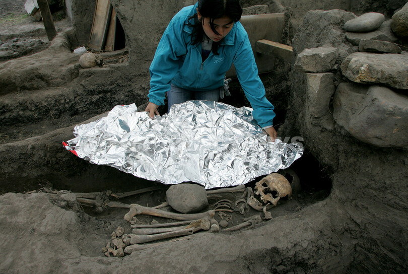 ニュース ライフ コロンビアで1500年前の古代人の骨が出土 2008年4月23日 21:38 発信地:ウスメ/コロンビア [ 中南米 コロンビア ] このニュースをシェア ‹ › ❮ 7/9 ❯ コロンビアの首都ボゴタ(Bogota)郊外ウスメ(Usme)地区で、発掘した人骨を保存するため覆いをかける人類学者(2008年4月21日撮影)。(c)AFP/Mauricio Duenas 画像作成中 ! 【4月23日 AFP】コロンビアの首都ボゴタ(Bogota)郊外ウスメ(Usme)地区で21日、発掘作業が行われ、7つの墓が発見された。コロンビア国立大学(Colombian National University)のJose Virgilio Becerra人類学部長によると、ここは約1500年前の儀式場で、今後の作業で600以上の墓が発見されるとみられる。(c)AFP ライフ 一覧へ> メディア・報道関係・法人の方向け 写真・動画 購入のお問合せ>
