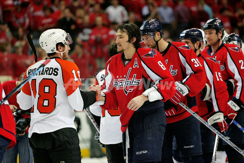 スポーツ ウインタースポーツ フライヤーズ キャピタルズとの接戦制し準決勝へ 2008年4月23日 15:18 発信地:ワシントンDC/米国 [ 北米 米国 ] このニュースをシェア ‹ › ❮ 4/7 ❯ 試合後に握手を交わすキャピタルズのアレキサンダー・オベチキン(%%Alexander Ovechkin%、右)とフライヤーズのマイク・リチャーズ(%%Mike Richards%%)。(2008年4月22日撮影)(c)AFP/Getty Images/Len Redkoles 画像作成中 ! 【4月23日 AFP】07-08NHL、東カンファレンス・1回戦。ワシントン・キャピタルズ(Washington Capitals)vsフィラデルフィア・フライヤーズ(Philadelphia Flyers)、第7戦。試合はジャフリー・ルーパル(Joffrey Lupul)がオーバータイムにパワープレイゴールを決め、フライヤーズが3-2でキャピタルズを下し4勝目を挙げて準決勝へ進出を決めた。(c)AFP ウインタースポーツ 一覧へ> メディア・報道関係・法人の方向け 写真・動画 購入のお問合せ>