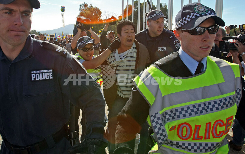 警察は中国支持派とチベット支持派が接近しないように努めたが、国会議事堂前などリレールート上数か所で衝突が発生した。ただし、オーストラリア五輪委員会(Australian Olympic Committee、AOC)は両派間の緊張感をサッカーの試合の雰囲気になぞらえ、聖火リレーは「おおむね平和的に進んでいる」と述べている。(c)AFP