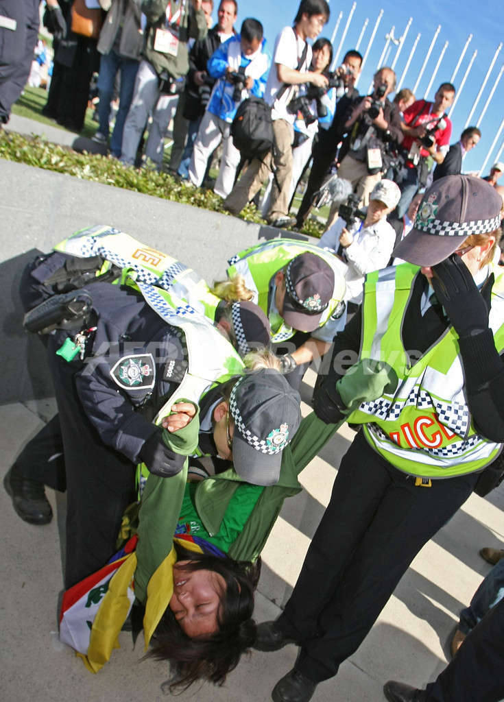 警察は中国支持派とチベット支持派が接近しないように努めたが、国会議事堂前などリレールート上数か所で衝突が発生した。ただし、オーストラリア五輪委員会(Australian Olympic Committee、AOC)は両派間の緊張感をサッカーの試合の雰囲気になぞらえ、聖火リレーは「おおむね平和的に進んでいる」と述べている。(c)AFP