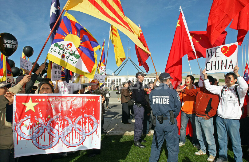 警察は中国支持派とチベット支持派が接近しないように努めたが、国会議事堂前などリレールート上数か所で衝突が発生した。ただし、オーストラリア五輪委員会(Australian Olympic Committee、AOC)は両派間の緊張感をサッカーの試合の雰囲気になぞらえ、聖火リレーは「おおむね平和的に進んでいる」と述べている。(c)AFP