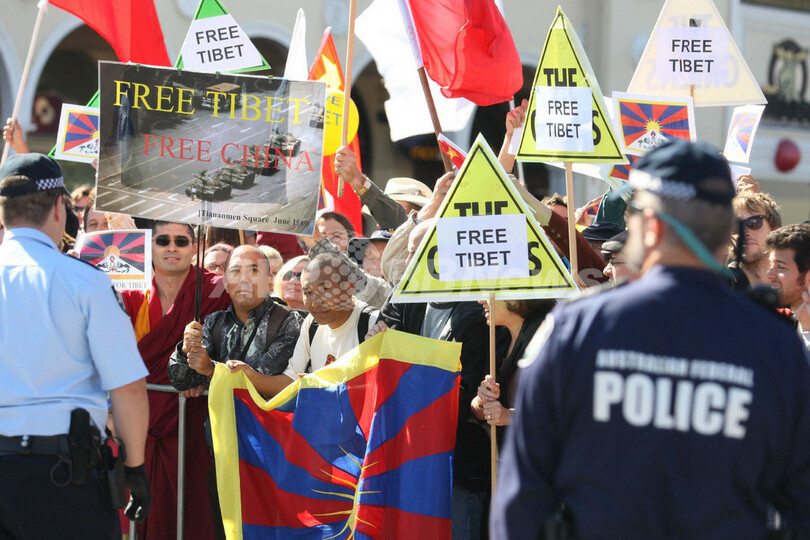 警察は中国支持派とチベット支持派が接近しないように努めたが、国会議事堂前などリレールート上数か所で衝突が発生した。ただし、オーストラリア五輪委員会(Australian Olympic Committee、AOC)は両派間の緊張感をサッカーの試合の雰囲気になぞらえ、聖火リレーは「おおむね平和的に進んでいる」と述べている。(c)AFP