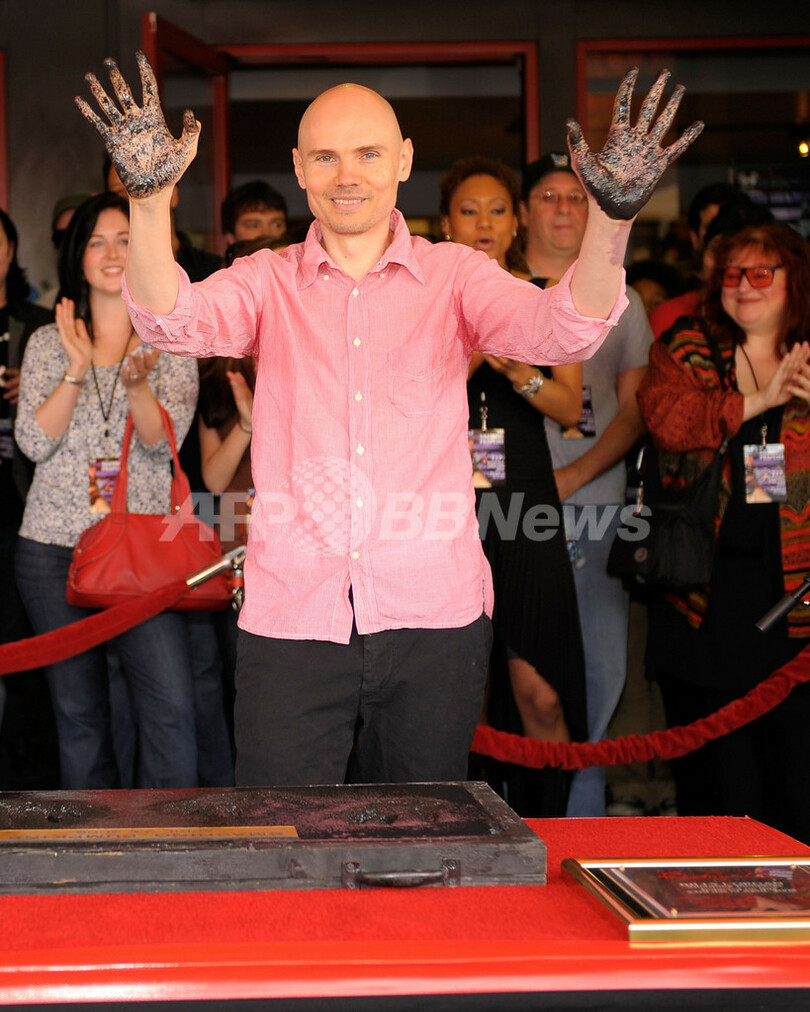 ロサンゼルス(Los Angeles)のギター・センター(Guitar Center)で行われた、ロックの殿堂「ハリウッド・ロック・ウォーク(Hollywood’s Rockwalk)」入りを記念する式典でポーズをとる米ロックバンド、スマッシング・パンプキンズ(The Smashing Pumpkins)のビリー・コーガン(Billy Corgan)。(c)AFP/Getty Images/Charley Gallay