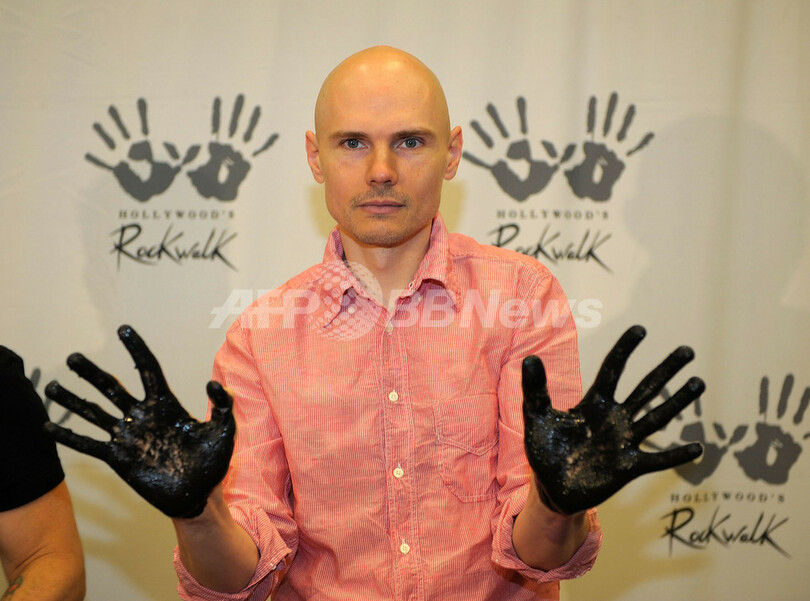 ロサンゼルス(Los Angeles)のギター・センター(Guitar Center)で行われた、ロックの殿堂「ハリウッド・ロック・ウォーク(Hollywood’s Rockwalk)」入りを記念する式典でポーズをとる米ロックバンド、スマッシング・パンプキンズ(The Smashing Pumpkins)のビリー・コーガン(Billy Corgan)。(c)AFP/Getty Images/Charley Gallay
