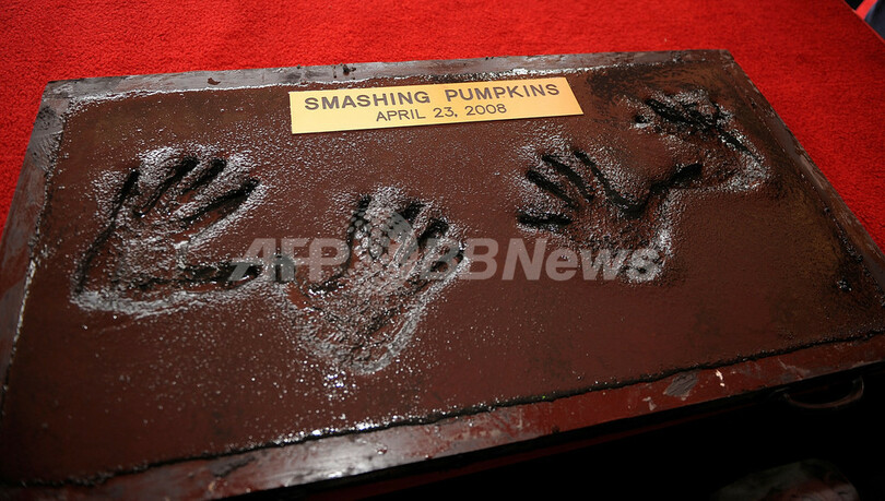 ロサンゼルス(Los Angeles)のギター・センター(Guitar Center)で行われた、ロックの殿堂「ハリウッド・ロック・ウォーク(Hollywood’s Rockwalk)」入りを記念する式典に置かれた、米ロックバンド、スマッシング・パンプキンズ(The Smashing Pumpkins)のジミー・チェンバレン(Jimmy Chamberlin)とビリー・コーガン(Billy Corgan)の手形。(c)AFP/Getty Images/Charley Gallay