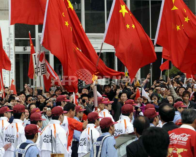 【4月26日 AFP】(写真追加)長野市で26日、北京五輪の聖火リレーが始まった。警官3000人以上がルート上で警備に当たっている。