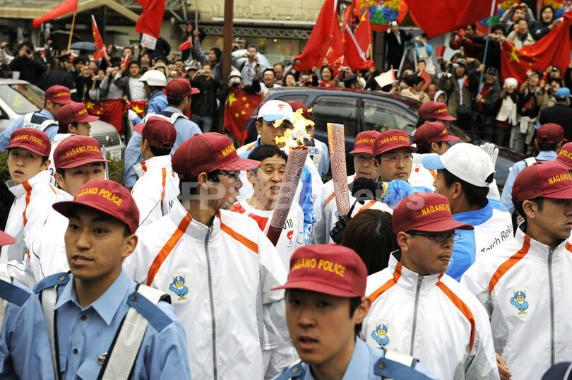 【4月26日 AFP】(写真追加)長野市で26日、北京五輪の聖火リレーが始まった。警官3000人以上がルート上で警備に当たっている。