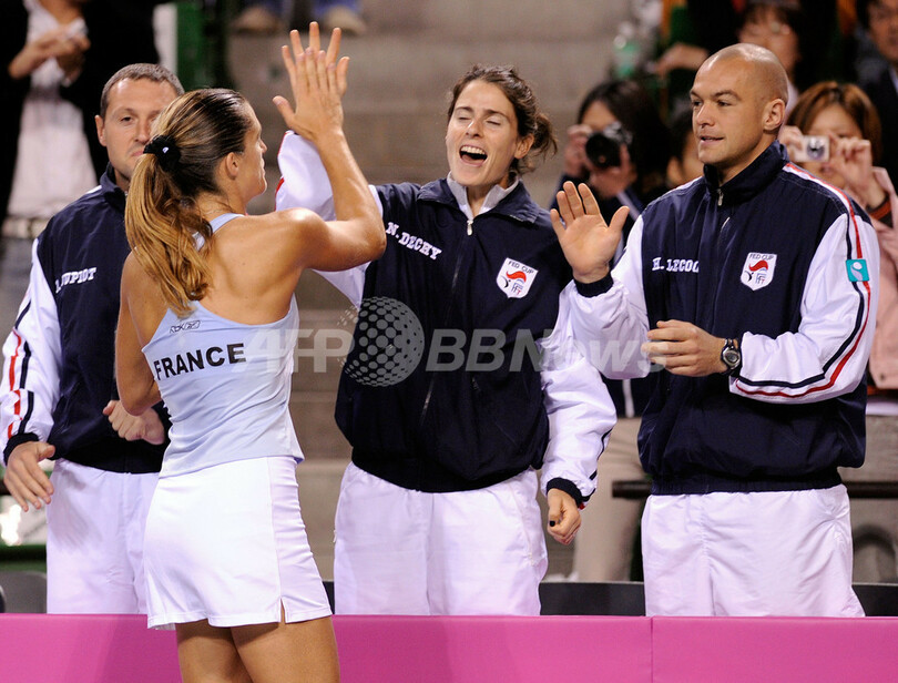 【4月26日 AFP】女子テニス、フェドカップ(2008 Fed Cup)・ワールドグループ・プレーオフ、日本vsフランス。フランスのアメリー・モウレズモ(Amelie Mauresmo)は、第1試合のシングルスで日本の森田あゆみ(Ayumi Morita)と対戦。試合はモウレズモがセットカウント2-0(6-0、6-2)のストレートで森田を下し、フランスは初戦を勝利で飾った。