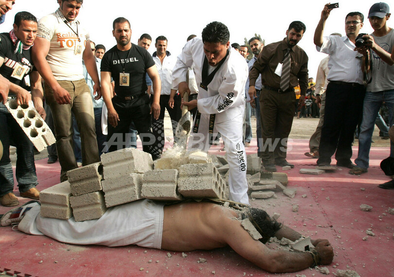 ニュース ライフ こぼれ話 ヨルダン人男性、テコンドーでギネスに挑戦 2008年4月27日 15:42 発信地:アンマン/ヨルダン [ 中東・北アフリカ ヨルダン ] このニュースをシェア ‹ › ❮ 2/2 ❯ ヨルダンの首都アンマン(Amman)で開かれた公開記録会で、体の上に積み上げられたブロックが割られるのに耐えるMustafa Dasanさん(2008年4月26日撮影)。(c)AFP/KHALIL MAZRAAWI 画像作成中 ! 【4月27日 AFP】ヨルダン人のテコンドー師範で6児の父のMustafa Dasanさん(54)が26日、首都アンマン(Amman)で審判団の立ち会いのもと、テコンドーの技を披露した。Dasanさんは、ギネス世界記録(Guinness World Records)挑戦のため、合計5000キロの大理石やセメントの板を1分16秒で割るなどした。(c)AFP ライフ 一覧へ> メディア・報道関係・法人の方向け 写真・動画 購入のお問合せ>