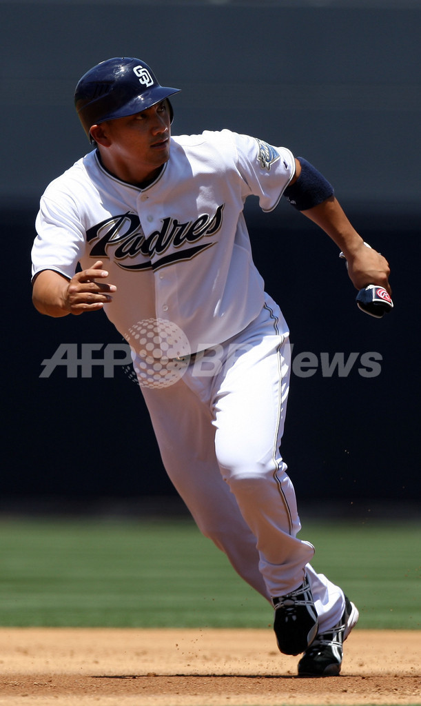 【4月27日 AFP】08MLB、サンディエゴ・パドレス(San Diego Padres)の井口資仁(Tadahito Iguchi)は、現地26日に行われたアリゾナ・ダイヤモンドバックス(Arizona Diamondbacks)戦に7番・二塁で先発出場し、13回裏にサヨナラ本塁打を放つなど5打数2安打1打点3得点を記録した。試合は井口の活躍によりパドレスが8-7でサヨナラ勝ちを収め、連敗を5で止めた。(c)AFP/Getty Images