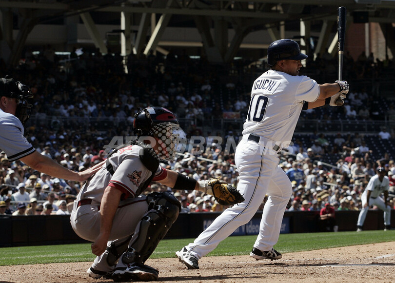 【4月27日 AFP】08MLB、サンディエゴ・パドレス(San Diego Padres)の井口資仁(Tadahito Iguchi)は、現地26日に行われたアリゾナ・ダイヤモンドバックス(Arizona Diamondbacks)戦に7番・二塁で先発出場し、13回裏にサヨナラ本塁打を放つなど5打数2安打1打点3得点を記録した。試合は井口の活躍によりパドレスが8-7でサヨナラ勝ちを収め、連敗を5で止めた。(c)AFP/Getty Images