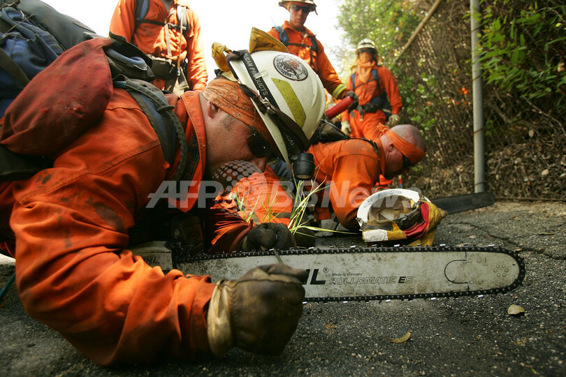 カリフォルニア州南部は、乾燥した気候や「サンタアナ(Santa Ana)」と呼ばれる強風に加え、郊外や森林地帯にまで住宅が急速に進出していることなどから、近年になって大規模な山火事が頻発。2007年10月には住宅2000棟を焼失し、死者7人、64万人が避難する同州史上最悪の山火事が発生した。この時の損害総額は10億ドル(約1000億円)規模に上った。(c)AFP/Paula Bustamante