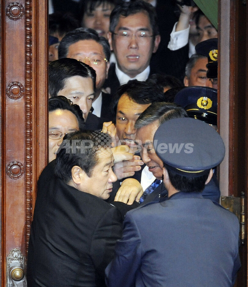 再可決に猛反発する民主党議員ら約100人が、河野洋平(Yohei Kono)衆院議長の本会議場入りを阻止しようと衆院議長室前に殺到し抗議行動を行ったため、場内は一時騒然となった。