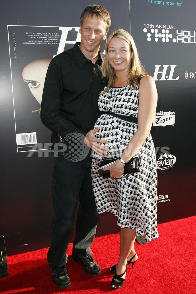 米カリフォルニア(California)州ハリウッド(Hollywood)のアヴァロン(Avalon)で開催されたハリウッドライフ(Hollywood Life)誌主催「第10回ヤング・ハリウッド・アワード(Young Hollywood Awards)」授賞式に登場したプロ・スケートボーダーのトニー・ホーク(Tony Hawk、左)と妻のLhotse Merriamさん(2008年4月27日撮影)。(c)AFP/Getty Images/Neilson Barnard