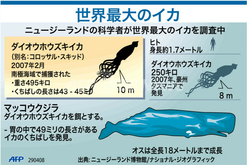 ニュース 環境・科学 図解 【図解】世界最大のイカ 2008年5月1日 15:46 発信地:ニュージーランド [ アジア・オセアニア ニュージーランド ] このニュースをシェア (c)AFP 【5月1日 AFP】図は、南極海域で2007年2月に捕獲された世界最大のイカ、ダイオウホウズキイカについて示したもの。(c)AFP<ニュース解説画像一覧へ> 環境・科学 一覧へ> メディア・報道関係・法人の方向け 写真・動画 購入のお問合せ>