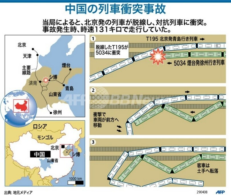 ニュース 社会 図解 【図解】中国、列車衝突事故の詳細 2008年5月1日 17:58 発信地:北京/中国 [ 中国・台湾 中国 ] このニュースをシェア (c)AFP 【5月1日 AFP】図は、中国東部の山東(Shandong)省シ博(Zibo)で4月28日に発生した列車衝突事故について詳しく示したもの。(c)AFP<ニュース解説画像一覧へ> 社会 一覧へ> メディア・報道関係・法人の方向け 写真・動画 購入のお問合せ>