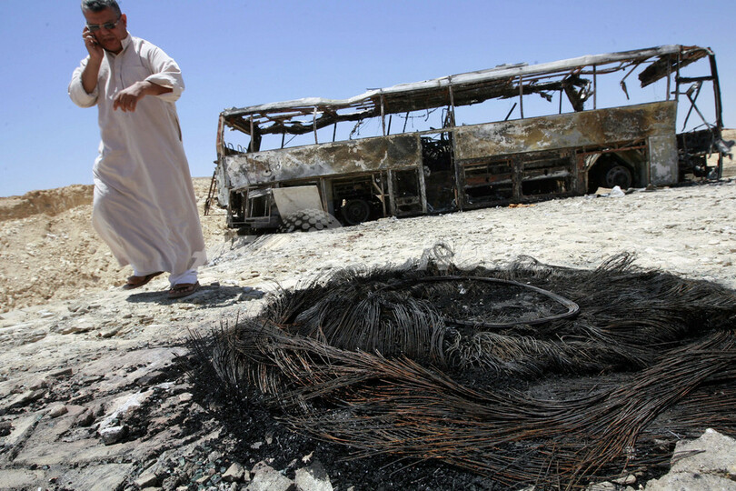 事故を起こしたバスは、シナイ半島のリゾート地シャルムエルシェイク(Sharm el-Sheikh)から首都カイロ(Cairo)へ向かっていた。鋭いカーブが続くスエズ(Suez)の南約70キロの地点で道から外れてコンクリート壁に衝突、横転した後に炎上した。