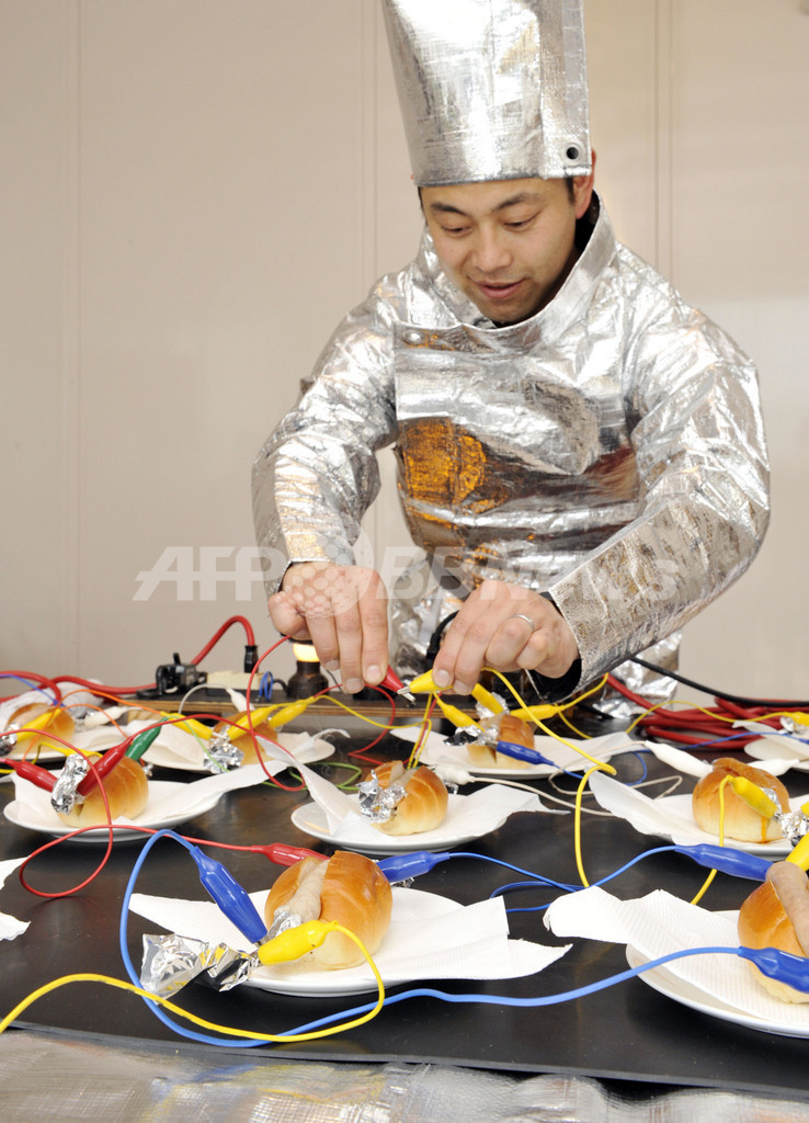 ニュース ライフ こぼれ話 おいしい芸術品、直流電流でホットドッグ 2008年5月4日 4:54 発信地:千葉 [ アジア・オセアニア 千葉 ] このニュースをシェア ‹ › ❮ 5/7 ❯ 千葉県柏市で、アートイベントに出展された直列接続で電流を流してソーセージを加熱するホットドッグの作品「電気ショッククッキング」(2008年5月3日撮影)。(c)AFP/Yoshikazu TSUNO 画像作成中 ! 【5月4日 AFP】(5月7日 一部更新)千葉県柏市で3日、アートイベントが開かれた。参加アーティストの1人は「電気ショッククッキング」と題し、手作りのソーセージを使ったホットドッグの作品を発表した。ソーセージに直列接続で電流を流し、直接加熱して料理する。同様にしてステーキやケーキも焼けるという。(c)AFP ライフ 一覧へ> メディア・報道関係・法人の方向け 写真・動画 購入のお問合せ>