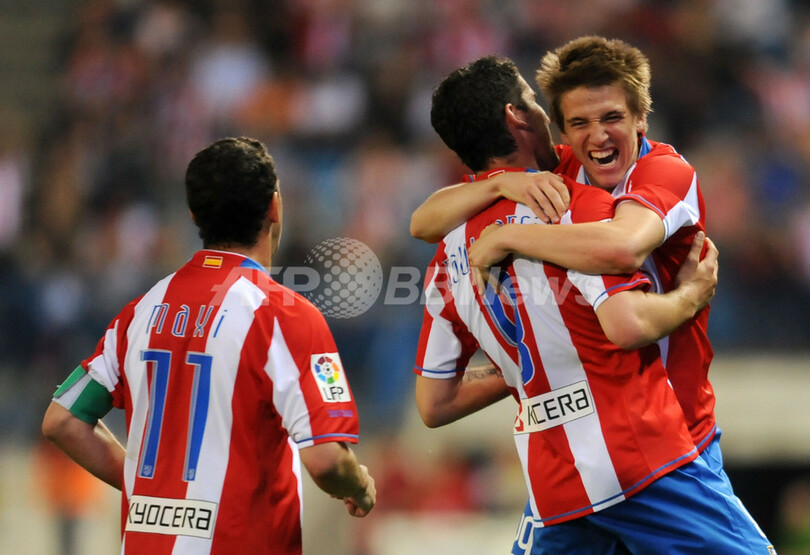 【5月4日 AFP】07-08スペイン・リーガエスパニョーラ1部・第35節、アトレティコ・マドリード(Atletico de Madrid)vsレクレアティボ(Recreativo Huelva)。試合はアトレティコ・マドリードが3-0で快勝し、2008-09シーズンの欧州チャンピオンズリーグ(UEFA Champions League)の出場権を争う5位のラシン・サンタンデール(Racing Santander)に勝点差5をつけて4位座を守った。(c)AFP/Phil Seery