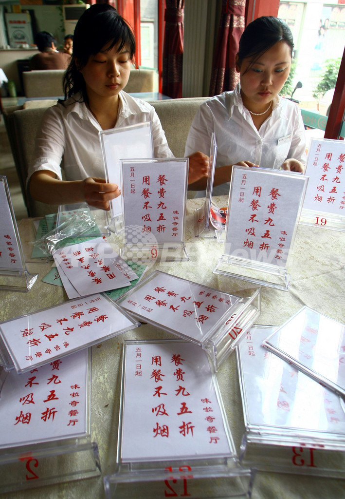 五輪 北京市、五輪控え禁煙規制を強化 2008年5月4日 12:20 発信地:北京/中国 [ 中国・台湾 中国 ] このニュースをシェア 北京(Beijing)市内のレストランで「タバコを吸わなければ割引きします」との表示を準備するウエートレス。(2008年5月1日撮影)(c)AFP 【5月4日 AFP】中国の首都・北京(Beijing)市は1日、北京五輪を「無煙五輪(Smoke-free Olympics)」とすることを目指し、公共の場での喫煙を制限する規制を導入した。これにより市内のホテルやレストランはその一部を禁煙としなければならない。中国の食堂やレストランではタバコの煙が鼻を突くほど充満する光景がこれまでしばしば見られた。(c)AFP 五輪 一覧へ> メディア・報道関係・法人の方向け 写真・動画 購入のお問合せ>