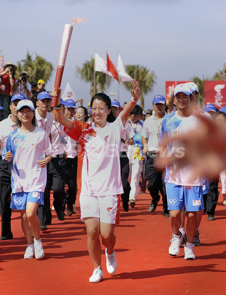【5月4日 AFP】(写真追加、一部更新)中国・海南島(Hainan)三亜市(Sanya)で4日、厳戒態勢のなか北京五輪の聖火リレーが行われた。第1走者は、スピードスケートの五輪金メダリスト・楊揚(Yang Yang)さんが務めた。