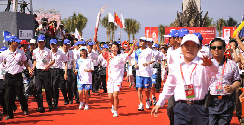 【5月4日 AFP】(写真追加、一部更新)中国・海南島(Hainan)三亜市(Sanya)で4日、厳戒態勢のなか北京五輪の聖火リレーが行われた。第1走者は、スピードスケートの五輪金メダリスト・楊揚(Yang Yang)さんが務めた。