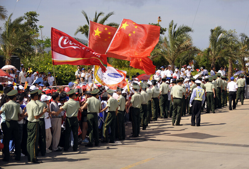 【5月4日 AFP】(写真追加、一部更新)中国・海南島(Hainan)三亜市(Sanya)で4日、厳戒態勢のなか北京五輪の聖火リレーが行われた。第1走者は、スピードスケートの五輪金メダリスト・楊揚(Yang Yang)さんが務めた。