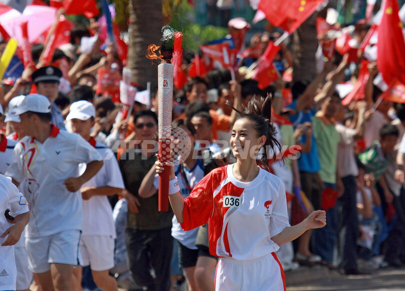 【5月4日 AFP】(写真追加、一部更新)中国・海南島(Hainan)三亜市(Sanya)で4日、厳戒態勢のなか北京五輪の聖火リレーが行われた。第1走者は、スピードスケートの五輪金メダリスト・楊揚(Yang Yang)さんが務めた。