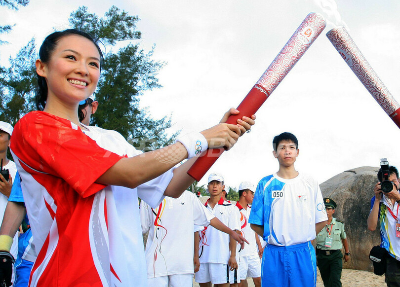 聖火リレーには俳優のジャッキー・チェン(Jackie Chan)や女優のチャン・ツィイー(Zhang Ziyi)も参加した。(c)AFP
