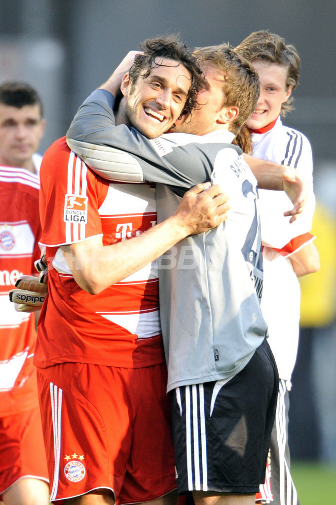 ボルフスブルクと引き分けて勝ち点を67としたバイエルンは、3試合を残し2位につけるヴェルダー・ブレーメン(Werder Bremen)との勝ち点差を10に広げ2年ぶりのリーグ優勝を果たした。2007-08シーズンにバイエルンはドイツ・リーグカップ(German League Cup)とドイツカップ2007-2008(German Cup 2007-2008)を既に制しており、リーグ優勝を加えて国内3冠を成し遂げた。(c)AFP/Ryland James