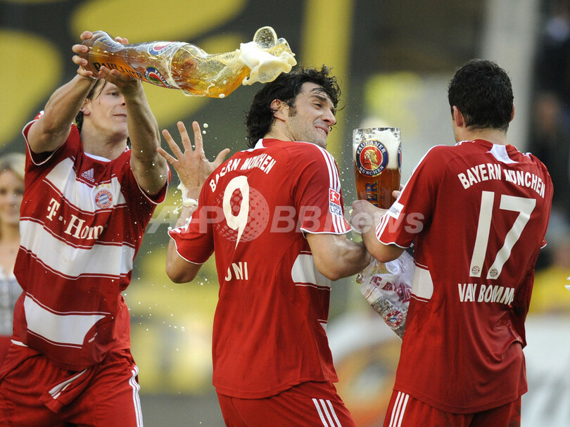 ボルフスブルクと引き分けて勝ち点を67としたバイエルンは、3試合を残し2位につけるヴェルダー・ブレーメン(Werder Bremen)との勝ち点差を10に広げ2年ぶりのリーグ優勝を果たした。2007-08シーズンにバイエルンはドイツ・リーグカップ(German League Cup)とドイツカップ2007-2008(German Cup 2007-2008)を既に制しており、リーグ優勝を加えて国内3冠を成し遂げた。(c)AFP/Ryland James