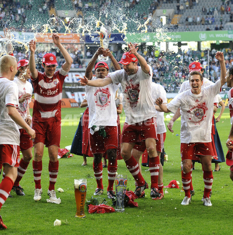 ボルフスブルクと引き分けて勝ち点を67としたバイエルンは、3試合を残し2位につけるヴェルダー・ブレーメン(Werder Bremen)との勝ち点差を10に広げ2年ぶりのリーグ優勝を果たした。2007-08シーズンにバイエルンはドイツ・リーグカップ(German League Cup)とドイツカップ2007-2008(German Cup 2007-2008)を既に制しており、リーグ優勝を加えて国内3冠を成し遂げた。(c)AFP/Ryland James